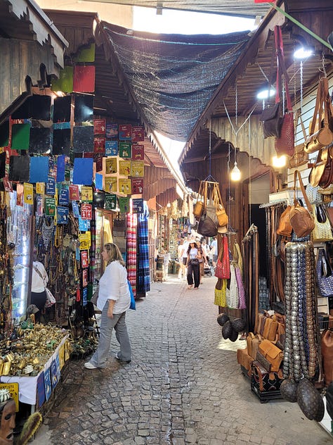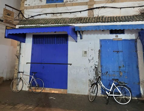 Less funny was being bossed into paying the “helpful” guide at the end of the shopping experience and then being assigned to another “helpful” guide who was supposed to be taking me back to the main square. After paying Mr. Helpful I was about to turn on my heel and walk off but a young man with what I would guess was probably moderate cerebral palsy popped up and my resolve to leave on my own weakened. I knew I had a small amount of money left and that he likely did have a genuinely harder time than his colleagues making money so I agreed to be “guided” (never mind that Google maps works brilliantly in the Medina) back to the main square. He was hustling and more than once I thought he was going to fall on the cobbles. I learned a new phrase as we pushed through the crowds - “piano, piano!” This was usually yelled out by locals who appeared to know him and didn’t want him to trip and fall. I looked it up when I finally got back to the hotel and it means “slowly, slowly” in Italian. Even I was saying it to him by the end.
