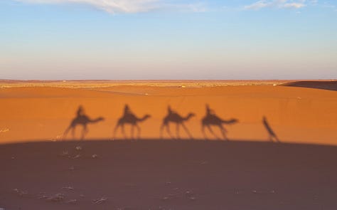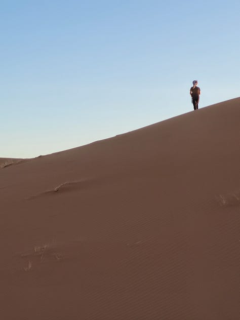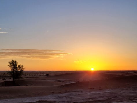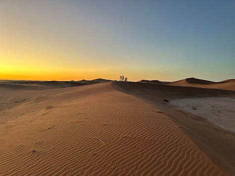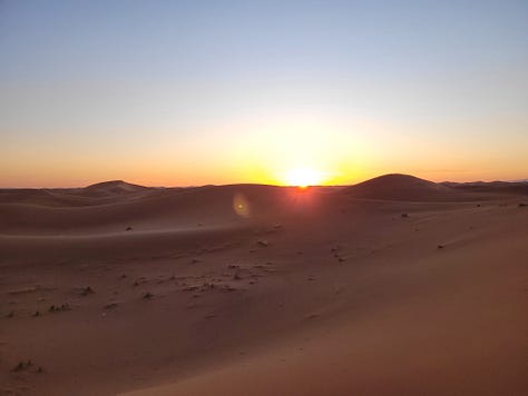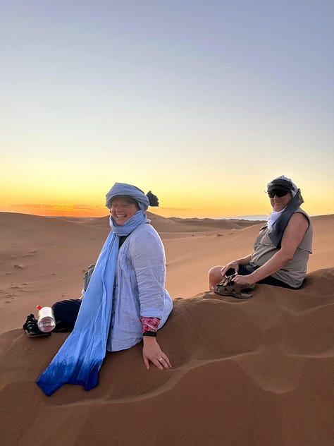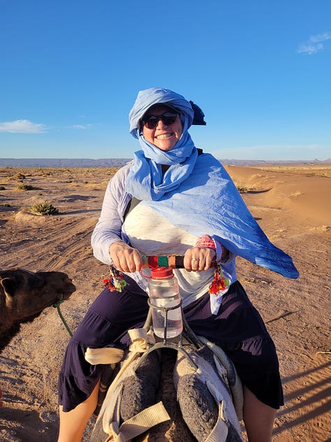 We spent a night in a rustic camp on the edge of the Sahara and rode dromedaries to a big dune to watch the sunset. We also got up early for the sunrise which was hard for me but it was so worth it.