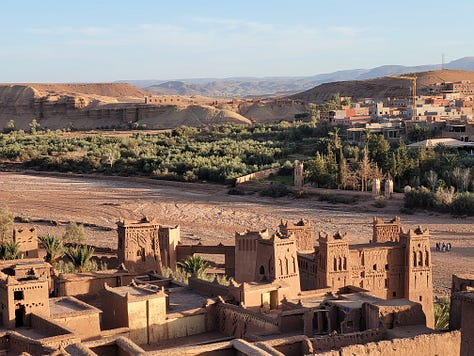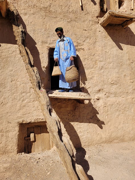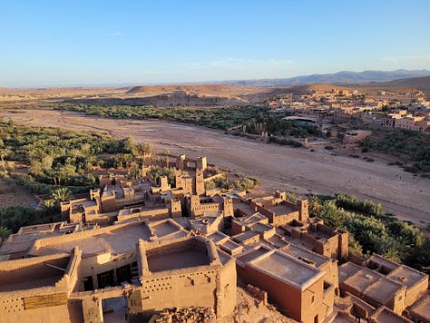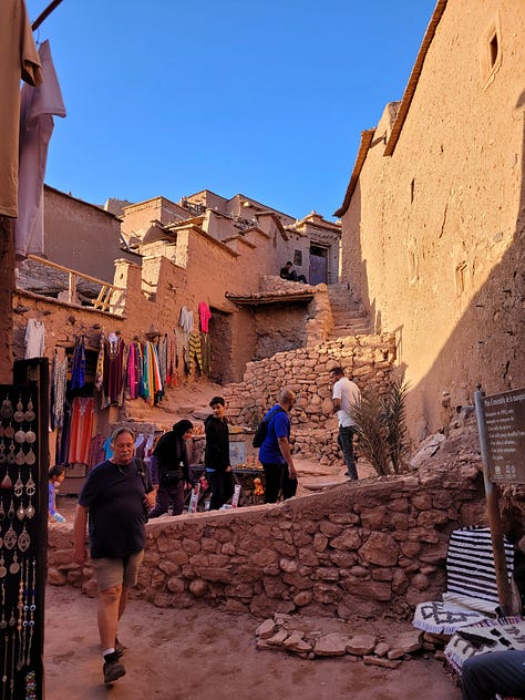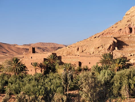 The tour segment I did was the 11 day South Morocco Discovery with Intrepid. I have never really thought much about travelling in Morocco but the timing fit so I booked it. It turns out southern Morocco is much less developed than northern Morocco. It sounds like travel is harder on the southern segment than it was on the northern bit but I was used to long travel days from the 2022 trip to southern and eastern Africa although the bus was smaller this time which made the journeys a bit less comfortable. One of the upsides of a less developed region for travellers was that the places we stopped were, on average, much less busy and touristy than the northern spots. We spent a night in a mountain village at a very clean and comfortable guest house and went for a hike (a source of MUCH debate among people who felt our mountain-confident guide’s definition of “easy” was not, in fact, easy. He quite fairly pointed out we were on the side of a mountain so *of course* some elevation was expected. )