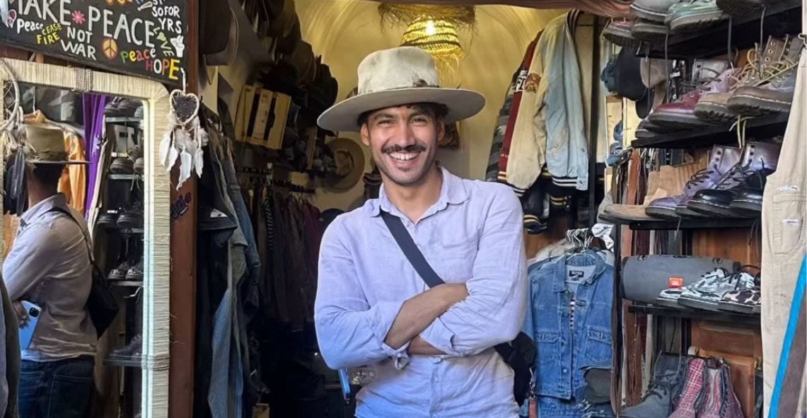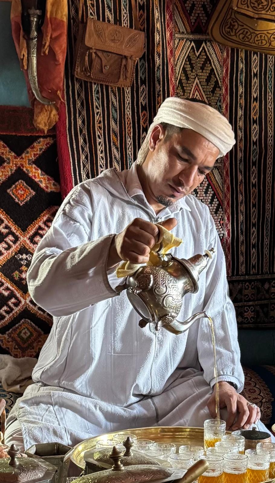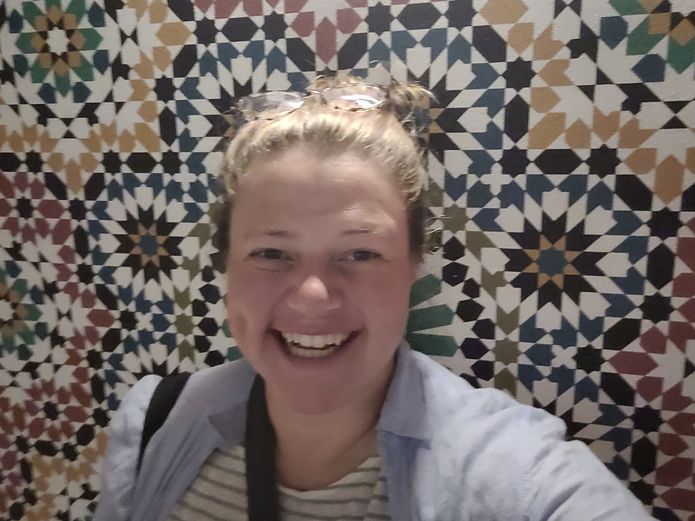 In spite of my best efforts to stay sharp and not get sucked into any scams I did get pulled into a racket where a “friendly” man who just happened to be going in my direction walked me to the tannery section of the Medina. He turned the corner and voila, a kind and surprisingly un-busy man just happened to be ready to take me for a tour. After the tour of the tannery (which, to be fair, was interesting) he popped me around the corner to a shop full of very beautiful things. One of them even made sure to take a picture of me,