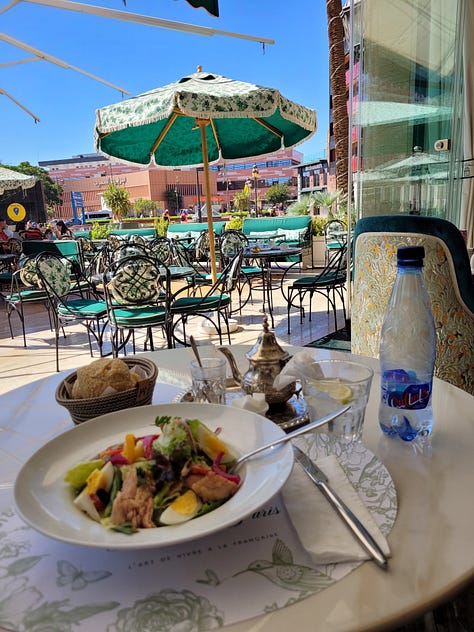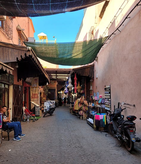 When I accepted the offer to share a home with this lovely family, I agreed to clear out for 10 days in mid-October so she could fulfil her commitment to a home share arrangement she booked earlier in the year. I looked at the cost to stay in Glasgow and soon realised that for not much more I could go to a new country so off I went! I found weekly direct flights from Edinburgh to Marrakesh and a 10 day Intrepid tour that started right in the middle of a two week window. So, on Oct 9 I was up at 3:45am and out the door at 4:15am to catch the 4:40 shuttle from central Glasgow to the Edinburgh Airport. The flight was smooth (other than parenting other people’s children the entire time 😒) and in a mere four hours (vs. 15 - 20 hours from Vancouver!!) I touched down in hot, dusty, chaotic Marrakesh. I was so not ready.